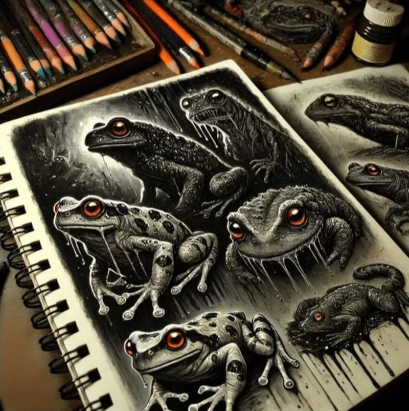 Amphibian sketching is the art of transforming ordinary frogs and salamanders into nightmare fuel with eerie details, exaggerated features, and haunting textures. Let’s be honest – these guys are already a little unsettling. Add glowing eyes, extra limbs, or a sinister grin, and suddenly they go from “cute pond dweller” to “horror movie material.”