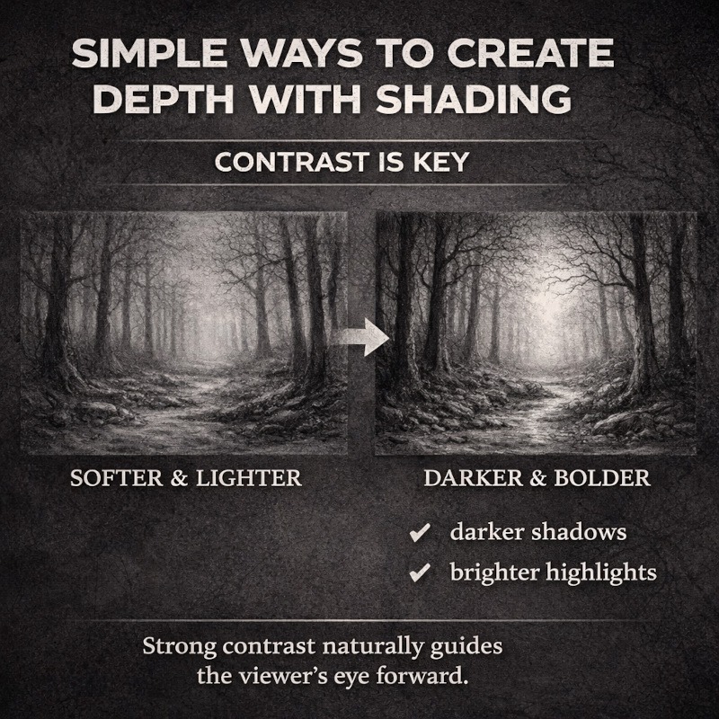 Depth is what stops your drawing from looking like it’s been pressed flat by a haunted ironing board. It gives your drawing space, mood, and that slightly unsettling feeling that something might be lurking just out of sight.