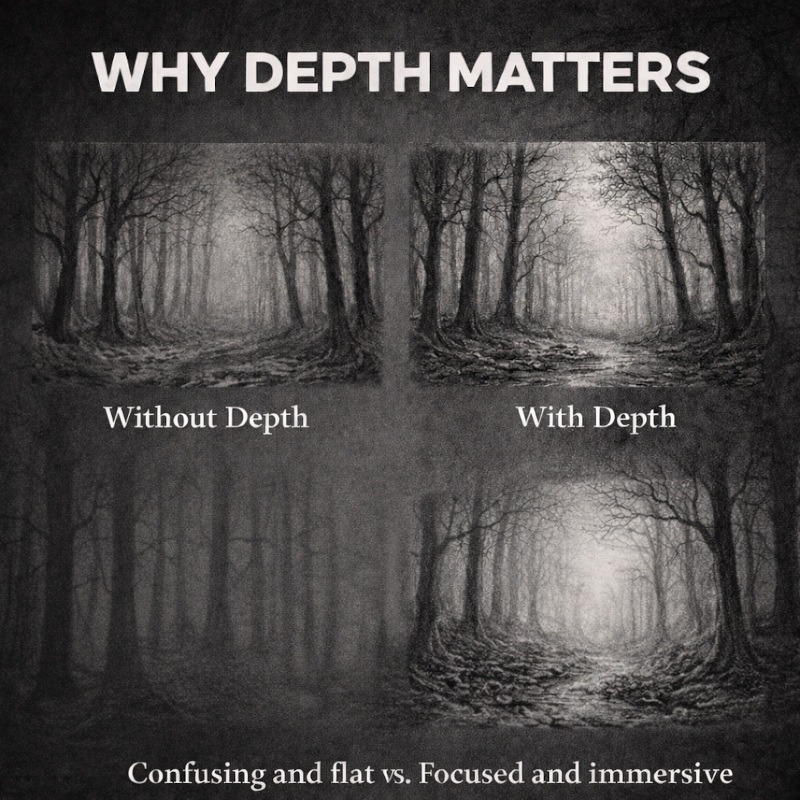 Without depth, drawings can feel flat or confusing. Everything sits on the same visual level, making it difficult for the viewer to understand what is close, what is far away, and where to focus.
