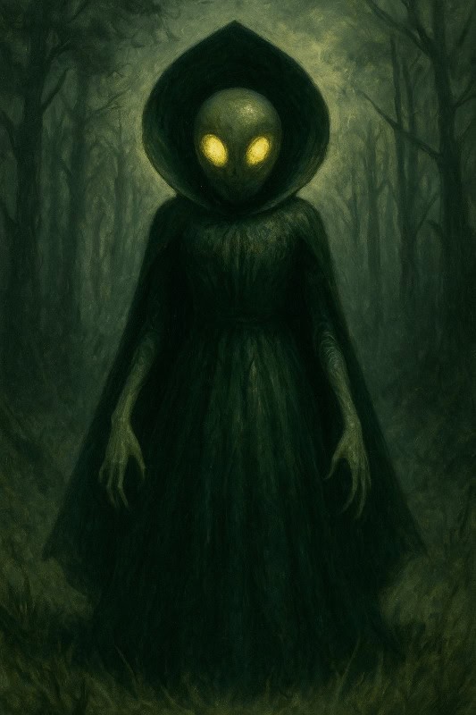 They described an eerie, towering figure at least ten feet tall. It had a spade-shaped head, glowing eyes, and a dark, metallic-looking body that glided silently above the ground. Some claimed it hissed. Others said it emitted a strange, choking mist that made them nauseous and dizzy. One person even described the stench of burning metal long after it disappeared.