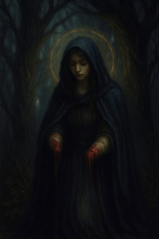 Draw her cloaked in shadows with her bandaged arms raised defiantly, blood seeping through the wrappings. The background can be a dim forest path, with faint glimmers of moonlight catching on her silhouette. - Devil’s Bargain: