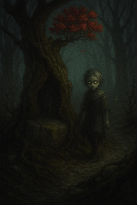 Illustrate a childlike ghost peeking from behind the Juniper Tree, its eyes hollow, its form part smoke, part bone, with petals or feathers drifting around it. - Broken Home: