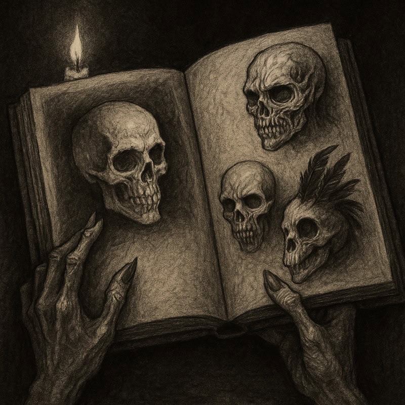 Example: A skull with crow feathers sprouting from the sides, beak-like cracks forming in the bone.