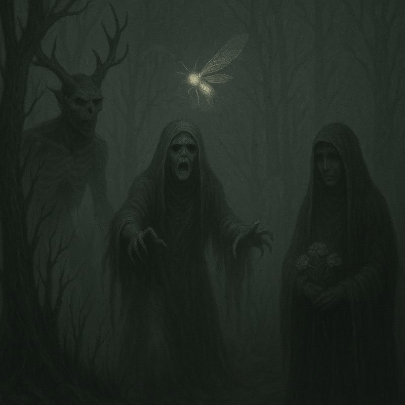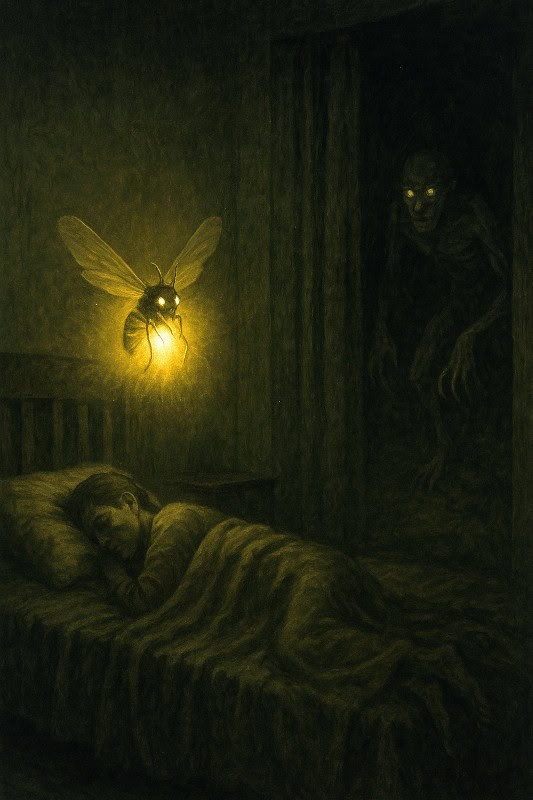 Split the image – one half a harmless glowing insect, the other a grotesque, hunched humanoid. Add sharp digits, hollow cheeks, and glowing amber eyes. Let the forms melt into each other, caught mid-transformation like something out of a cursed nightmare. - Window Scene:
