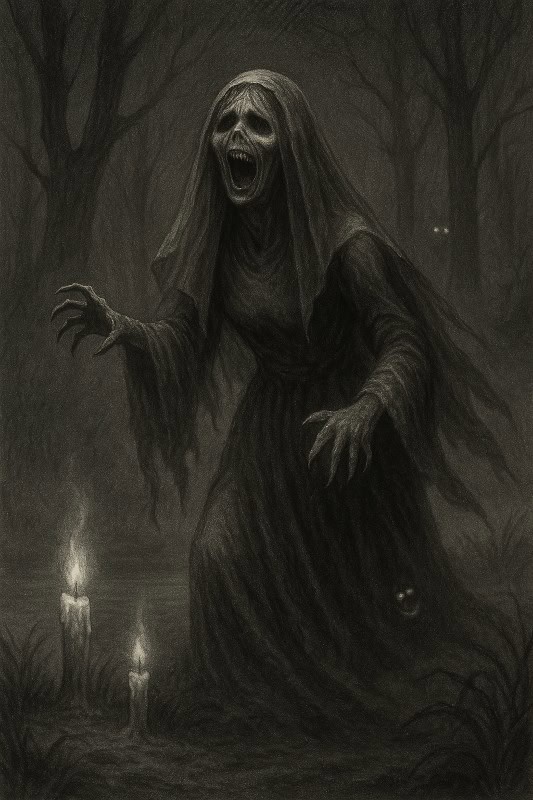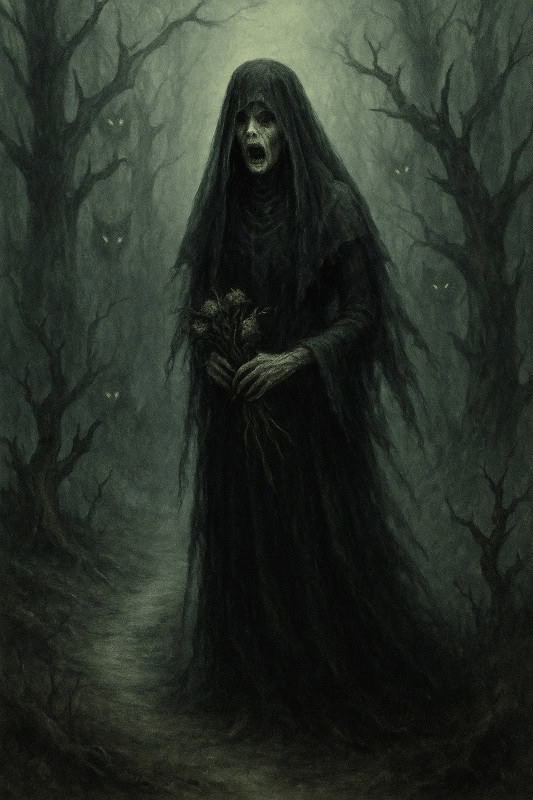 In South American folklore – especially Chilean legends – La Viuda (The Widow) is the ghost of a woman consumed by grief, betrayal, and rage. Some say she lost her beloved husband to another woman and died of heartbreak. Others claim she was murdered, her spirit left to wander the earth seeking revenge. In all tales, her sorrow curdled into hatred, and she rose again, shrouded in her long black morning veil, to punish the living.