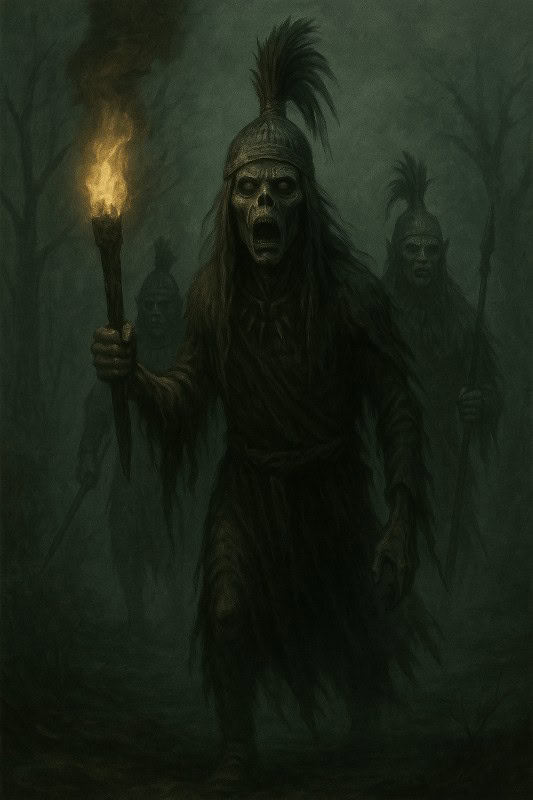 Show a glowing line of warriors marching through mist and darkness, torches flickering with eternal light. Their feet hover just above the ground, casting long shadows without leaving footprints. Include feathered cloaks, traditional helmets, and intense expressions to capture their authority. - Eerie Atmosphere: