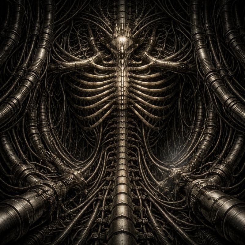 Giger’s style is known as biomechanical art. At its core, this is the fusion of organic forms and mechanical structures. Think bones merging into pistons. Ribcages morphing into architectural frameworks. Tendons blending into cables. Instead of drawing a monster and attaching metal parts like accessories, Giger fused everything so completely that separation felt impossible.