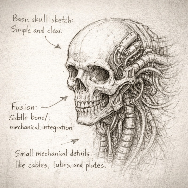 Use smooth shading to blend where bone meets metal. Add shadows so the mechanical parts feel embedded into the skull. Avoid heavy outlines that make the metal look like it was glued on five minutes before submission.