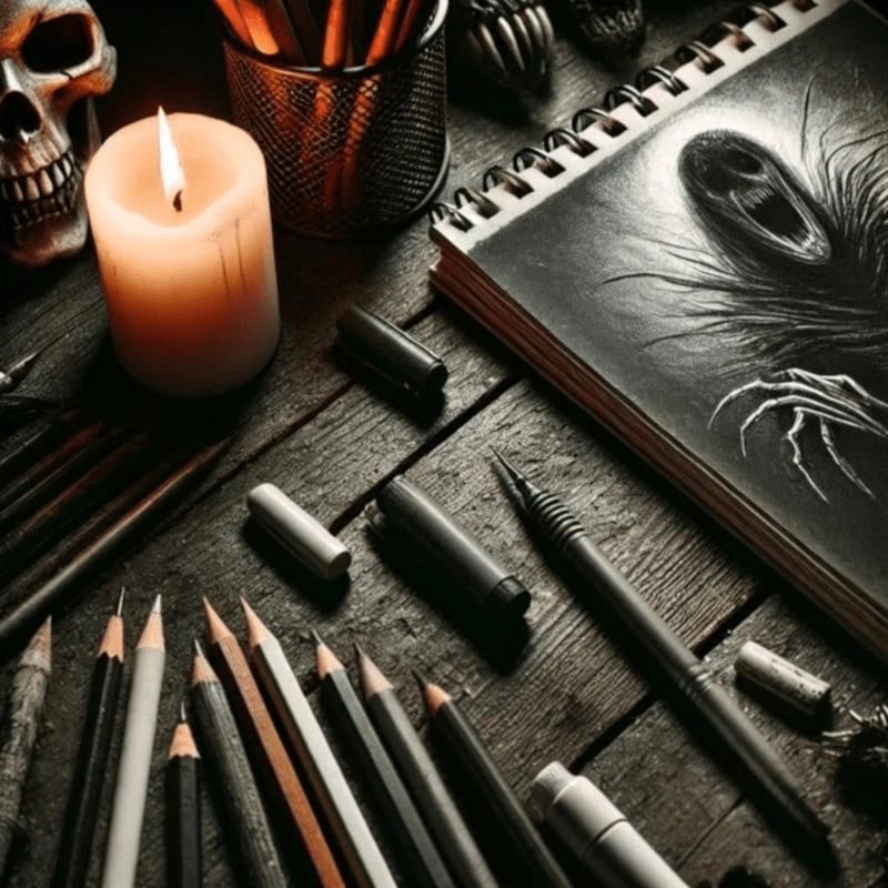 This guide will walk you through everything from essential sketching tools to advanced materials that add extra depth (and dread) to your artwork. If you’re starting out, stick to the basics: graphite, charcoal, and a solid sketchbook (no, your old shopping list won’t suffice). But if you’re looking to elevate your horror creations, we’ll explore additional materials such as white gel pens for eerie highlights or textured paper for that haunted house aesthetic.