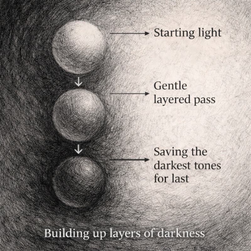 Layered shadows are not about pressing harder, rubbing the paper like it personally offended you, or adding more graphite until the page gives up. They are about building darkness slowly, in layers, so depth happens on purpose instead of by accident.