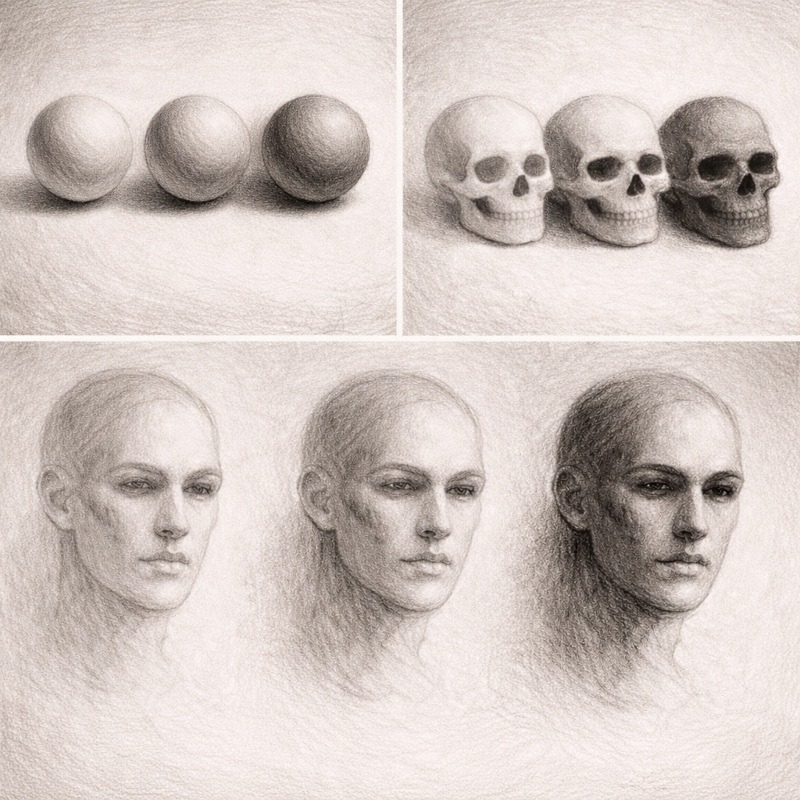 This exercise teaches you how to build darker values slowly, in layers, rather than trying to jump straight to the deepest shadows. It works with any subject, but a sphere, skull, or simple face is ideal for practice.