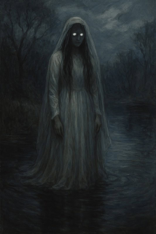 Always depicted in a long, billowing white gown and veil that obscures her face, she glides silently along rural roads, lonely bridges, riverbanks, and even through graveyards. Many believe she is the restless spirit of a young bride who died before her wedding day – either betrayed by her groom or struck down by cruel fate. In other versions, she took her own life after losing her children, unable to bear the weight of her grief.