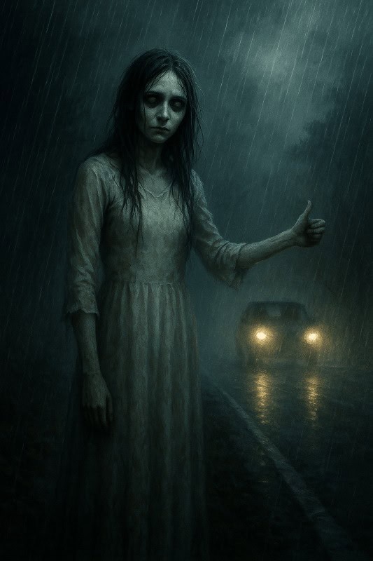 Some say she leaves behind a damp scarf, a faint wet footprint on the floor mat, or a shiver that lingers long after you’ve left her by the roadside. Others say she smiles at you in the rearview mirror just before vanishing, her eyes hollow with longing. And in the most chilling version… she doesn’t just vanish. She whispers your name before she’s gone, leaving you wondering how she knew it at all.