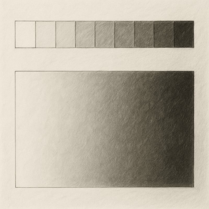 - Draw a row of 9 small boxes. Shade them from pure white (leave blank) to solid black, with each box a step darker than the last.