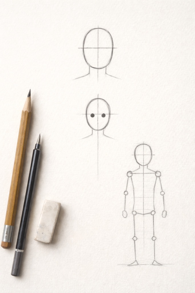 - Simple lines or shapes to suggest shoulders, hips, and limbs