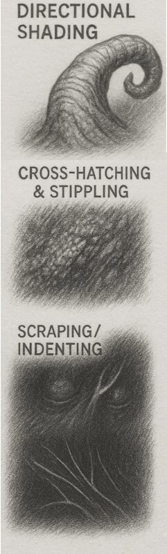 - Scraping & Indenting: Use a kneaded eraser or scratching tool (like a sewing needle) to create crisp highlights for scratches, veins, or wrinkles. Scratching is best done before shading, while erasing works well after layering graphite.
