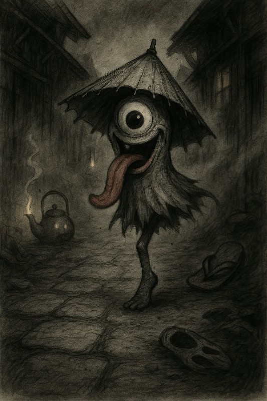 Imagine a midnight procession of warped belongings marching down an alley. The further back you look, the more monstrous they become – crumpled futons crawling on all fours, rusted alarm clocks with too many teeth, or ink pots dragging trails of dark ooze. - Karakasa-Creep:
