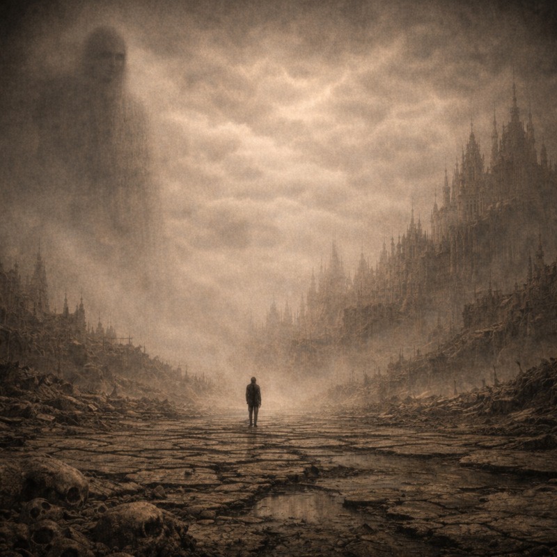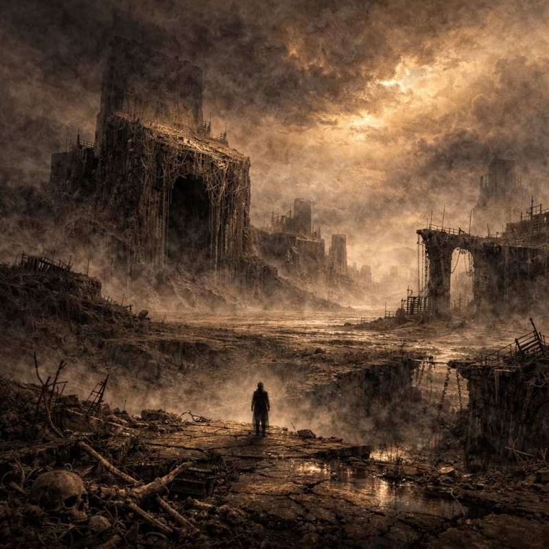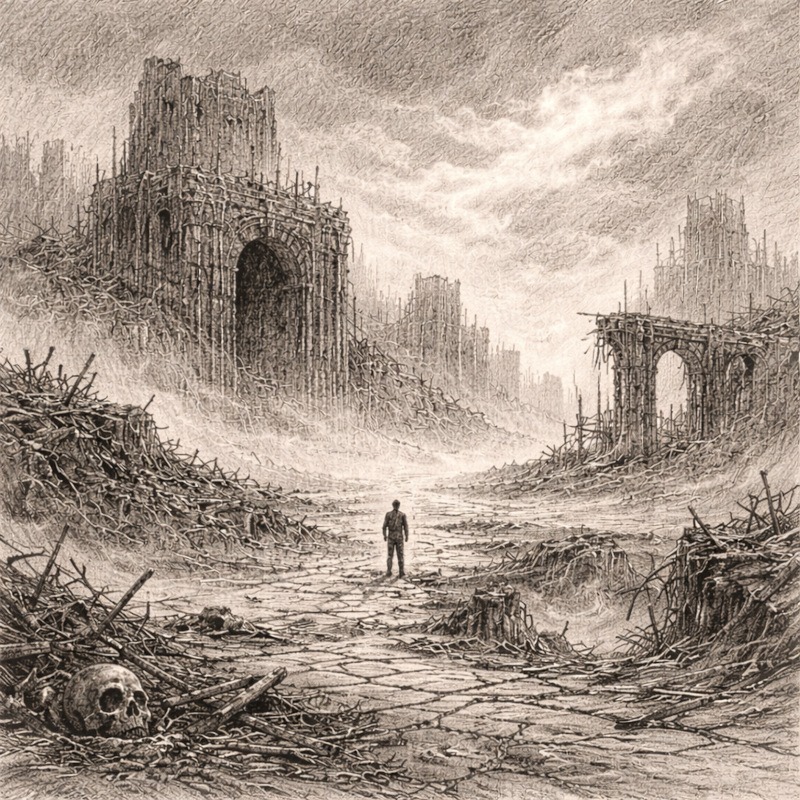 Scale plays a huge role here. When small figures appear inside these enormous spaces, they feel fragile and exposed. Isolation intensifies discomfort. A lone silhouette surrounded by ruin feels far more unsettling than a crowded, chaotic scene.